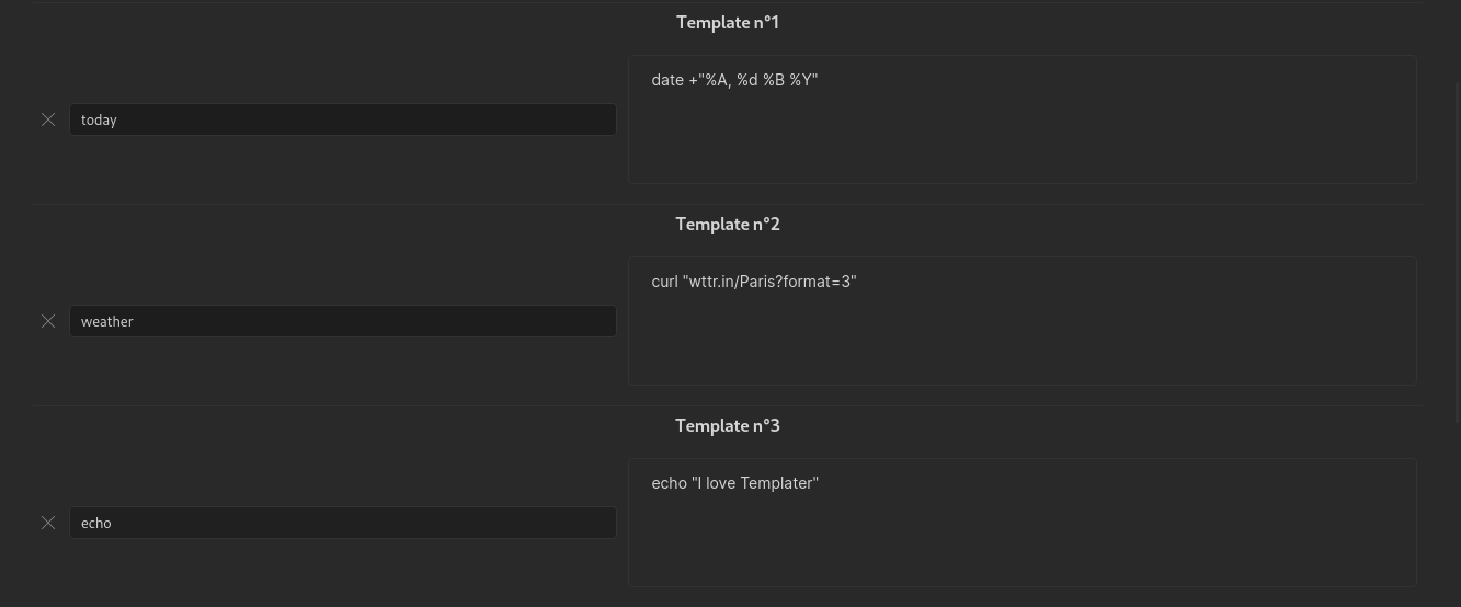 Once this is done, Templater will create a user function named after what you defined, that will execute your system command and return its output.